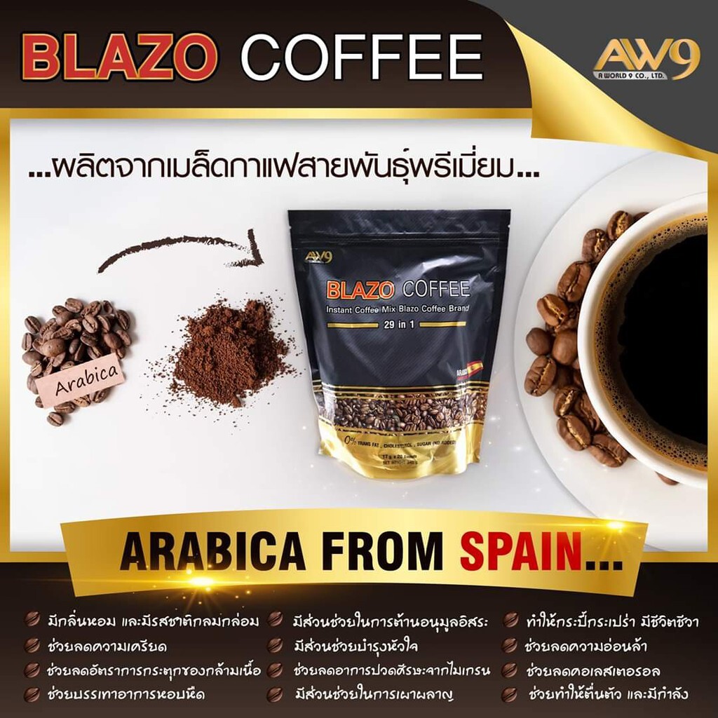 Blazo Coffee Instant Coffee Premium Arabica 29in1 on Tais 2020 aastal auhinnatud kohv, mis ühendab Hispaania päritolu araabika kohvi tugevate ja huvitavalt omapäraste ürtide segu. 29 looduslikku ekstrakti, sealhulgas Ganoderma lucidum, granaatõuna ja rohelise tee ekstrakt, pakuvad tervislikku ja aromaatset kohvielamust. Ilma suhkruta ja 0% kolesterooliga, see kohv pakub tõeliselt eriliselt huvitavat maitset, mida iseloomustab intensiivne aroom, mis täidab kogu toa. Lihtne valmistada – sega kuuma veega ja naudi iga lonksu tervislikkust ja maitsvat elamust!